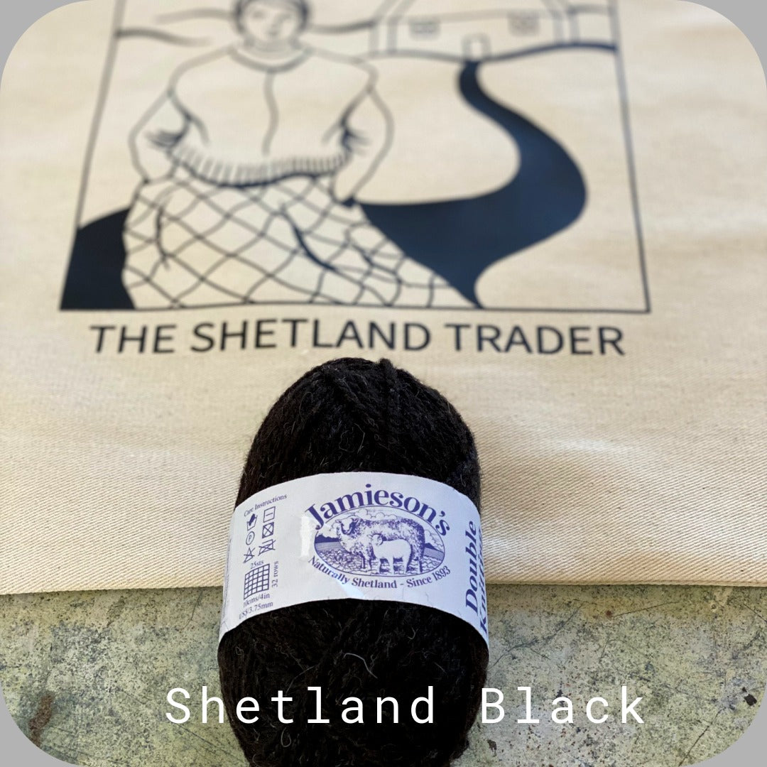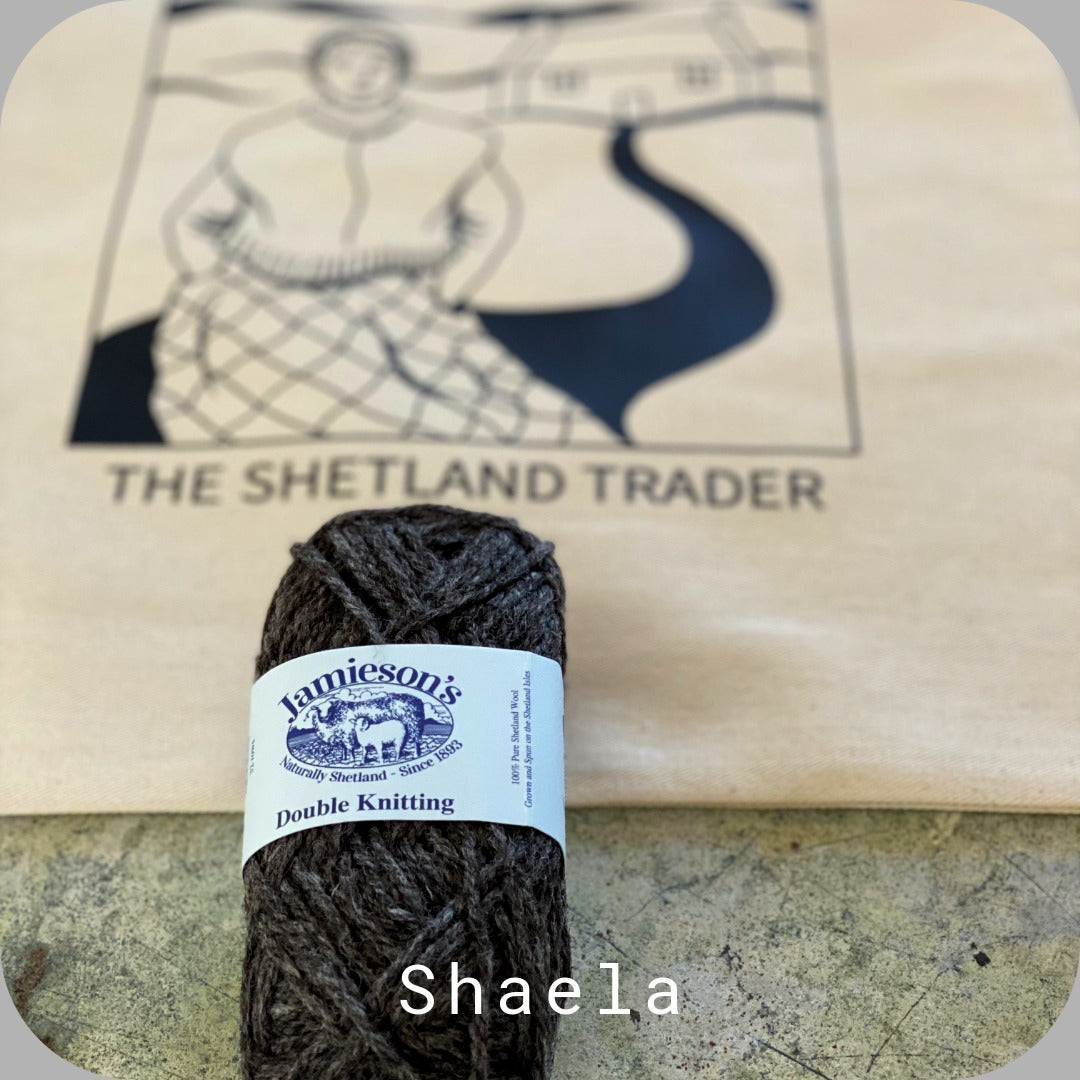 I have created kits in eight colorways from Jamieson's of Shetland DK yarn including the shade Titanic, used for the sample (in image). Wonderful woolly coziness awaits!